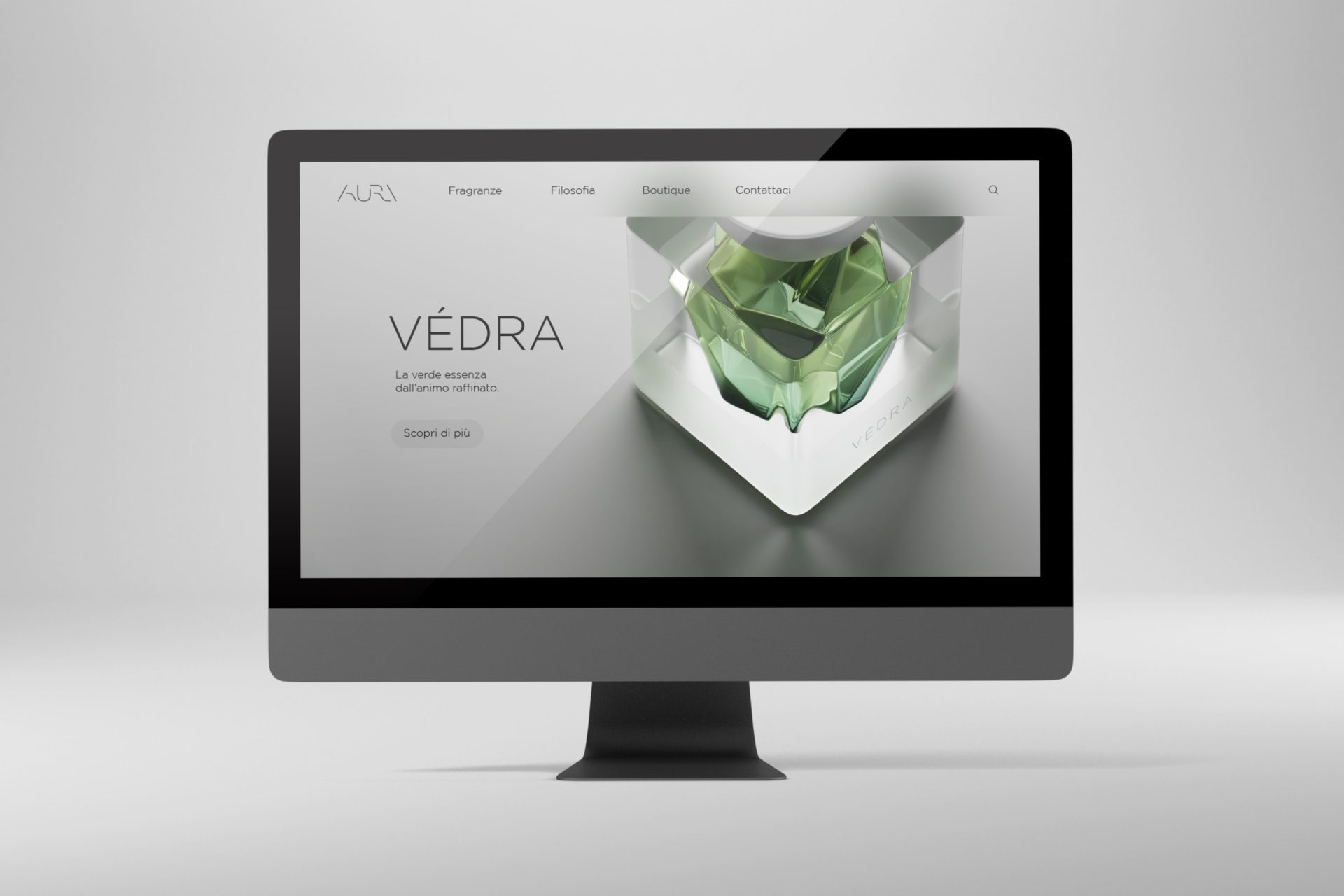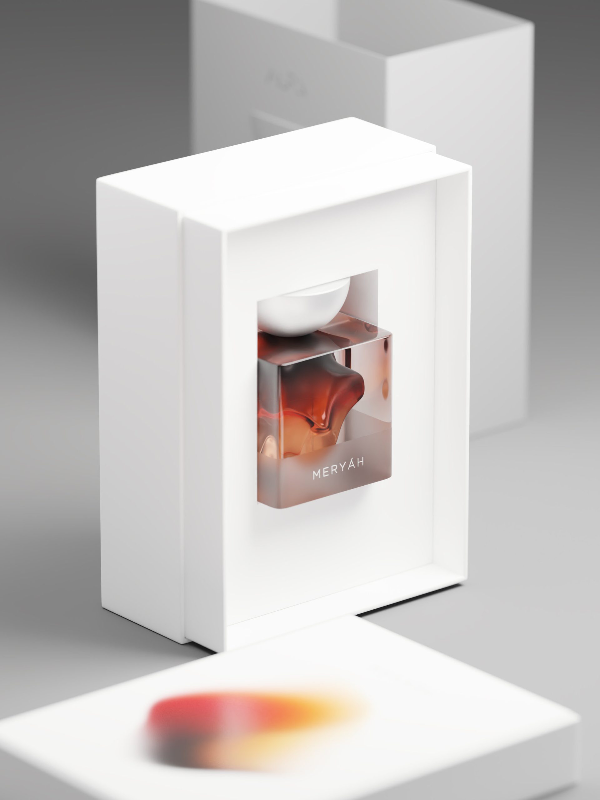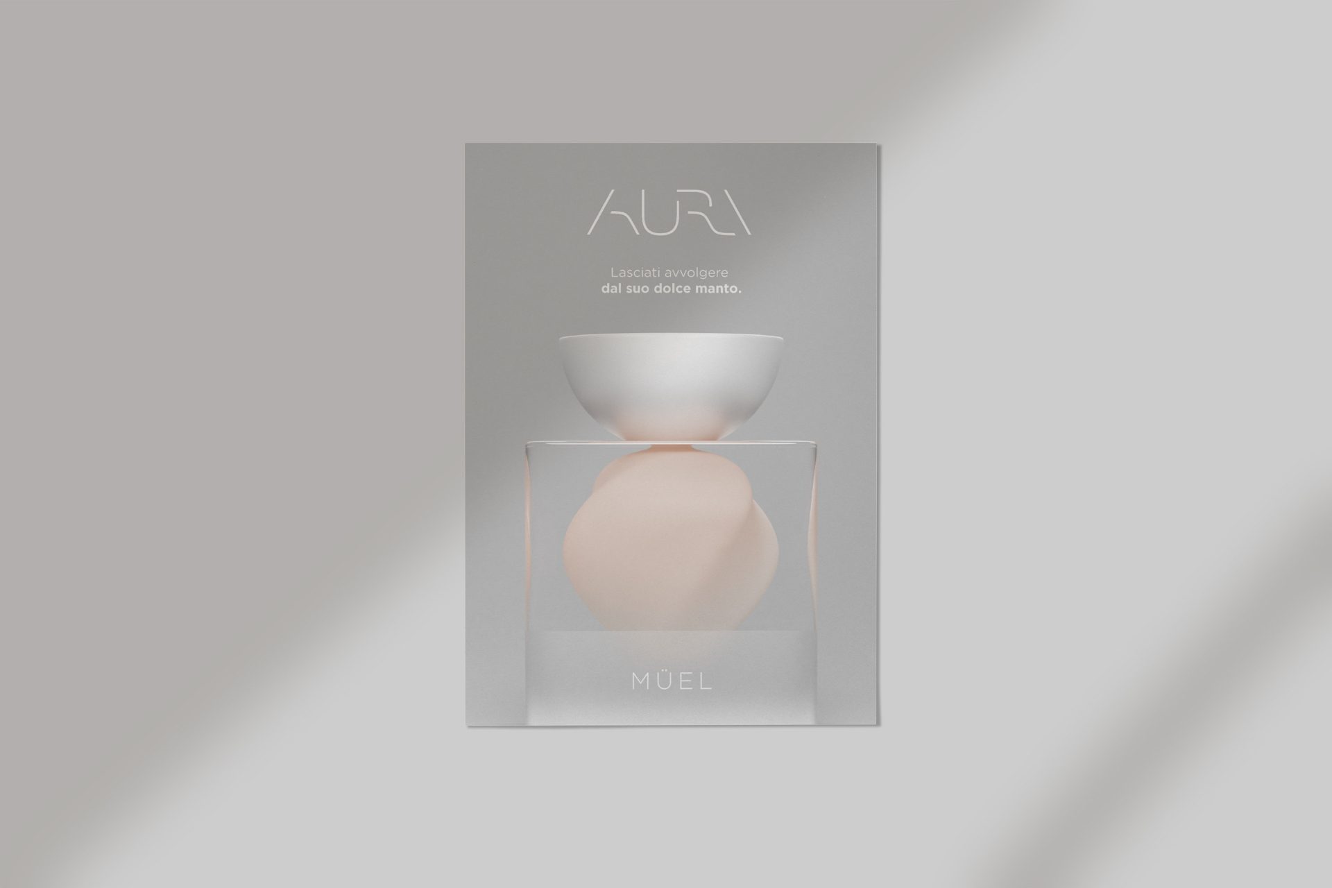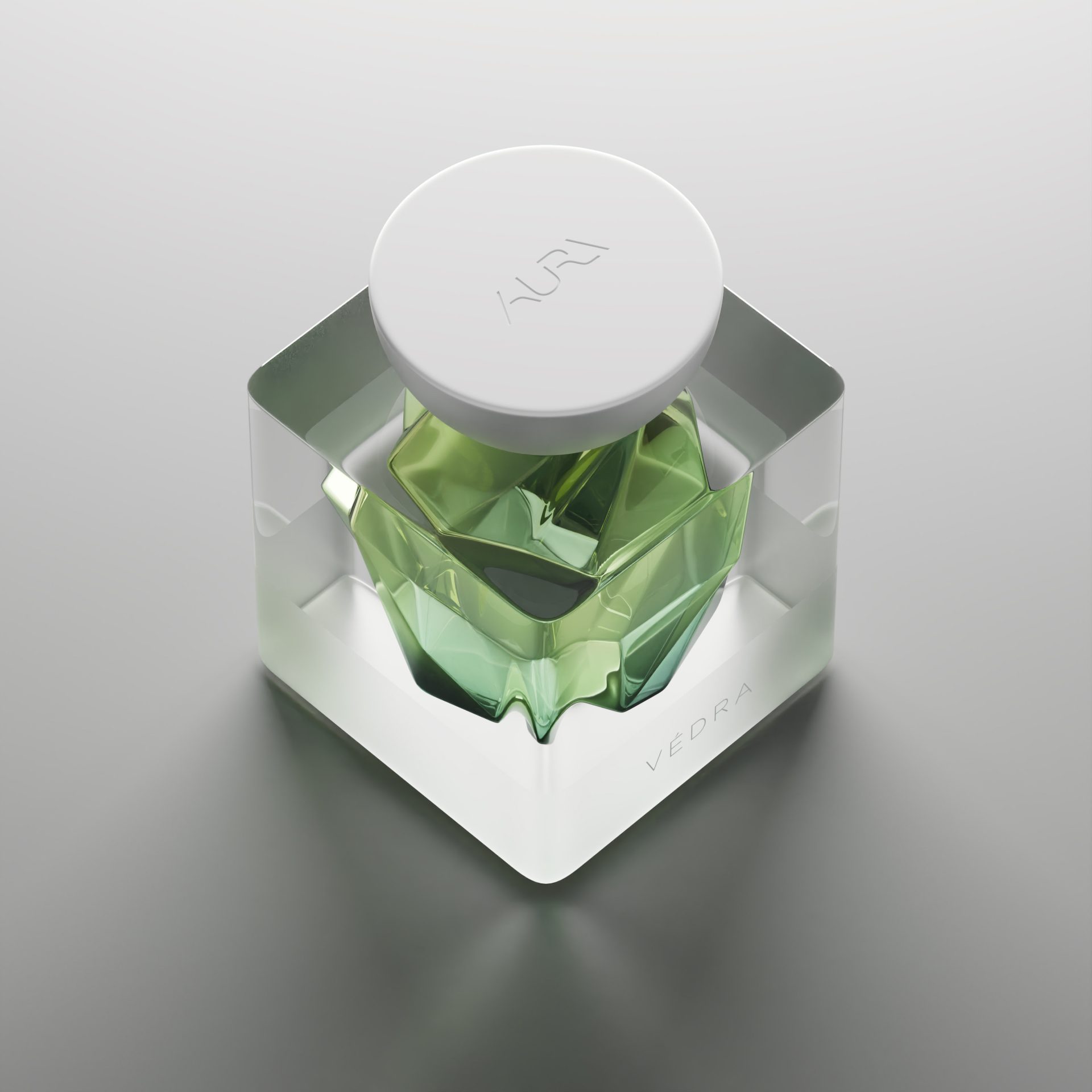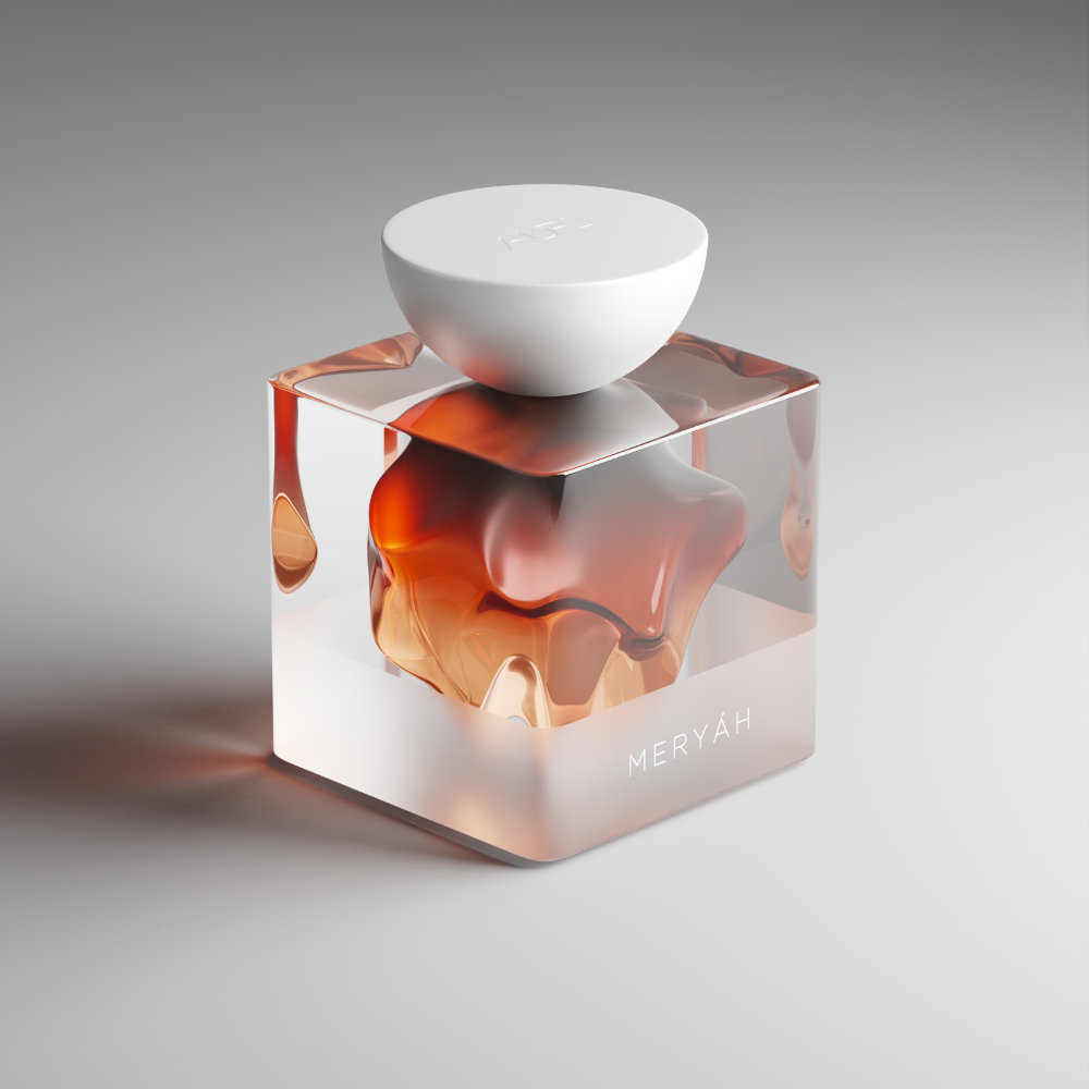 AURA costituisce uno dei miei più maturi studi sul tema dell’unione di più linguaggi visivi nella trasmissione di un messaggio, base fondante della sinestesia. Attraverso l’uso di specifiche forme e sfumature di colore, ho studiato una tecnica di rappresentazione visiva delle fragranze e dei loro sentori. Müel, dai toni cremosi e lattonici, presenta una boccetta il cui interno è curvilineo e uniforme, sui toni rosati di una crema dolce e luminosa. Védra, dall’apertura frizzante, agrumata e fougère, risulta visivamente più tagliente, spigolosa e aperta. Meryáh, dalle sfumature incensate e ambrate, profondamente ispirate al mondo medio-orientale, riprende nei colori e nella forma una resina densa e multiforme, come l’agarwood.